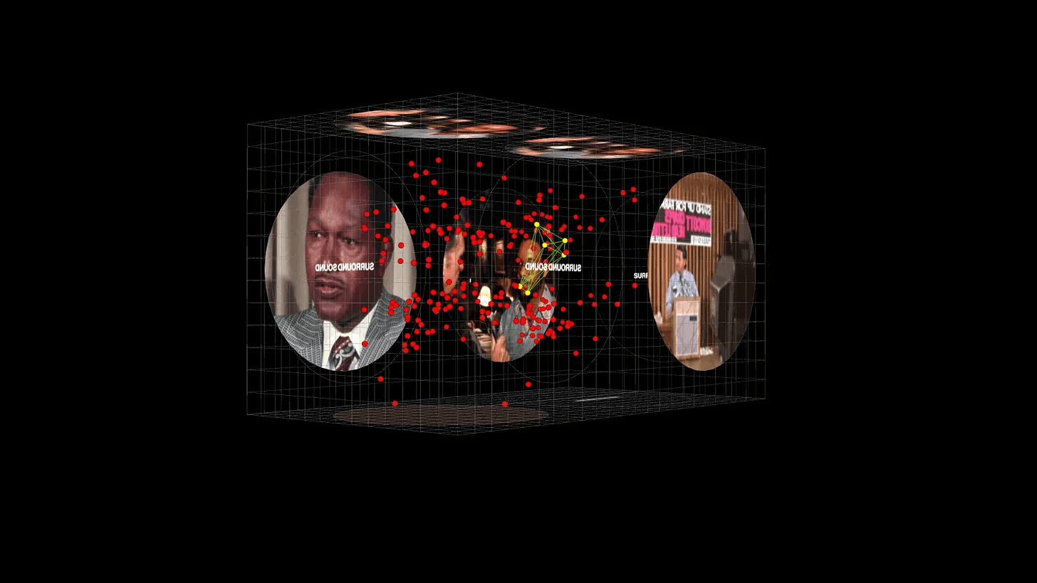 I was drawn most to the KTLA Newsfilm Collection featuring unaired footage from LA news coverage in the 70s-90s. In this footage, I was struck by the inclusion of different types of stories in the narrative fabric of Los Angeles. I was drawn to the way communities of color, working class communities, immigrants, and queer people were depicted on screen, the encounters they had with reporters, the way they were silenced, or not included at all. I used this material to create an interactive video installation that invites visitors into the guts of the television to see what is happening deep under the surface of the screen. I used noise systems, computer vision, and algorithmic processing to convert the archival images into a searchable database of vector embeddings—an ambivalent numeration that I suspected might unearth unseen connections across the nodes of the archive, uniting stories by the gesture of a subject, the tone of their voice, the words they use.